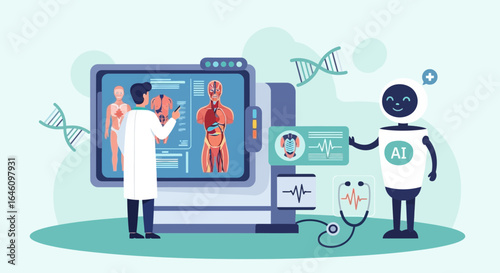 Doctor orthopedist, male and female characters examining xray scans of hip and leg joints, flat vector illustration. Human anatomy and healthcare. Traumatology and orthopedics.