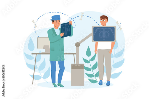 Doctor osteopath, male and female characters examining human spine skeleton, flat vector illustration. Osteopathy, chiropractic. Manual therapy.