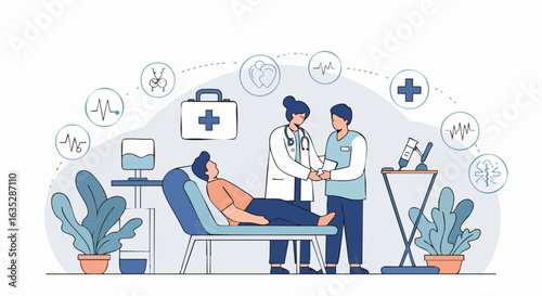 Doctor osteopath, male and female characters examining human spine skeleton, flat vector illustration. Osteopathy, chiropractic. Manual therapy.