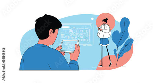 Doctor plastic surgeon drawing incision lines with marker on female face, flat vector illustration. Plastic surgery, cosmetic procedure. Chin, cheek enhancement. Facial contouring.
