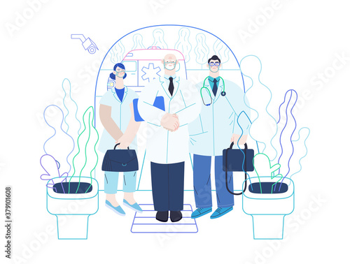 Doctors, tiny male, female characters examining patient eyesight, heart and ear health, flat vector illustration. Doctor otolaryngologist, ophthalmologist, physician checkup, consultation, appointment
