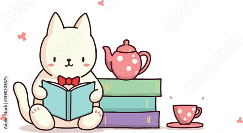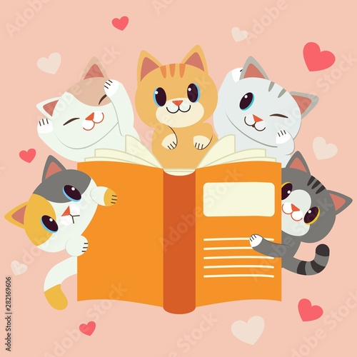 Dog and cat reading book vector. Smart pets cartoon icon. Cute animal character holding fairytale learning, studying illustration isolated on white background