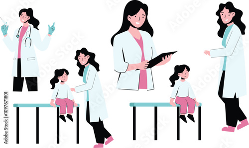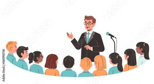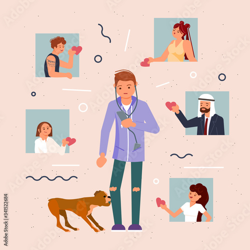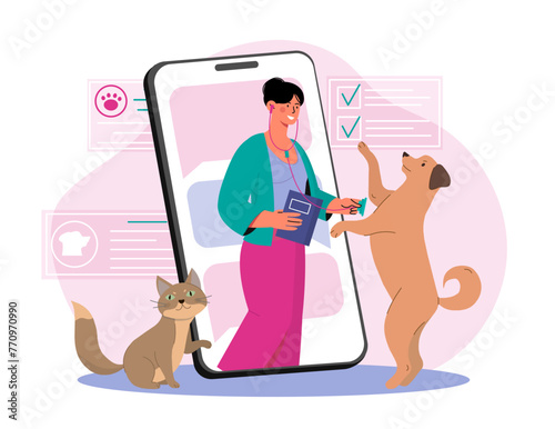 Dogs with winning medals sitting on winner pedestal and their happy owners celebrating victory, vector flat illustration. Dog contest, show, exhibition concept for poster, banner etc.