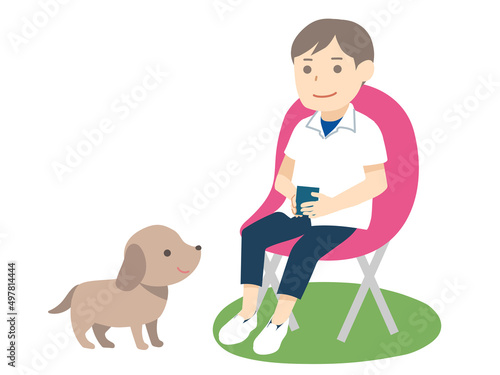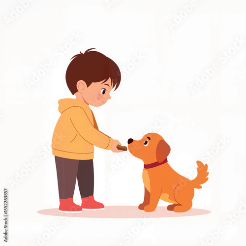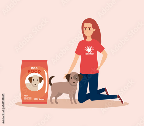 Vector illustration of woman with her dog, Pet owner and her puppy flat style design element, icon isolated on white background.