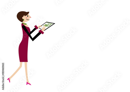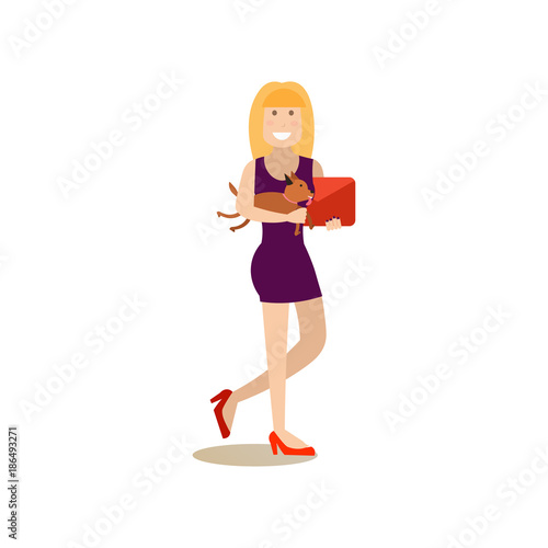 Vector illustration of woman holding her dog while walking in the street. Pet owner and her puppy flat style design element, icon isolated on white background.