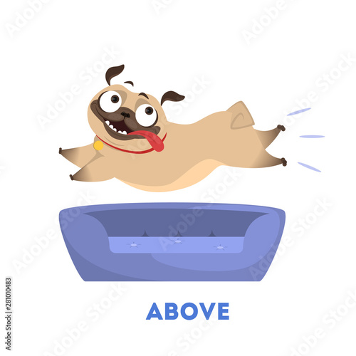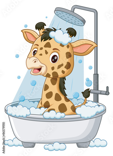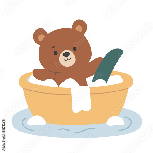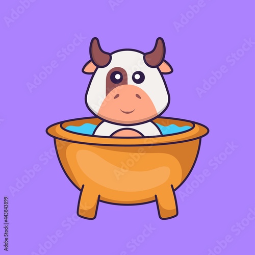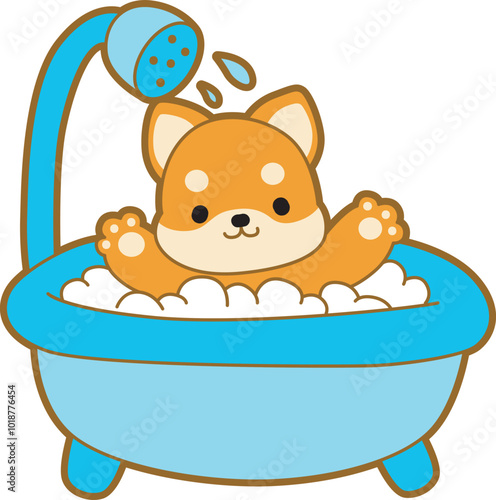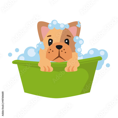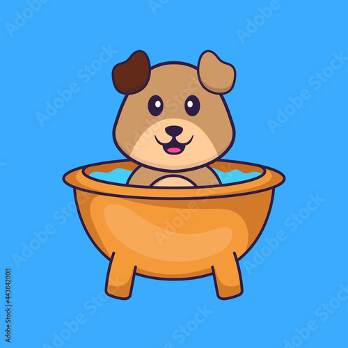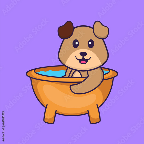 Dog washing in bath vector. Pet grooming cartoon icon. Animal spa. cute puppy in bathtub full of water and shampoo soap bubble isolated on white background. Canine hygiene and care