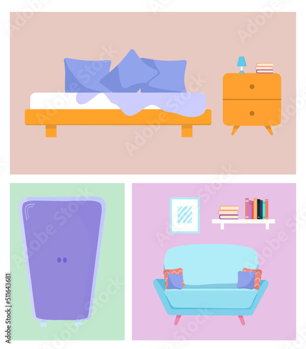Dressing table room vector. Woman furniture with shelves interior design. Perfume, cosmetic and cream bottle, beauty toiletry for girl body care on shelf isolated on white background
