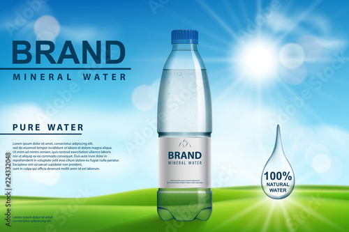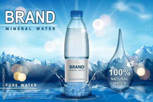 Drinking water ad design template. Vector realistic plastic mineral water bottles with your brand on blue background with water splashes, drops and ice cubes.