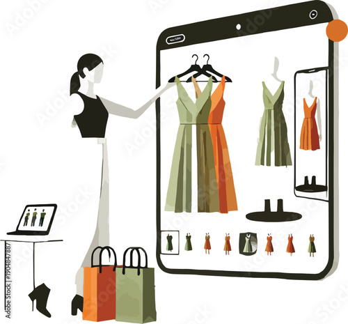 Vector illustration of dressmaker or clothing designer standing next to dummy dressed in new pink evening gown dress. Atelier, tailoring shop, fashion salon concept design element in flat style.