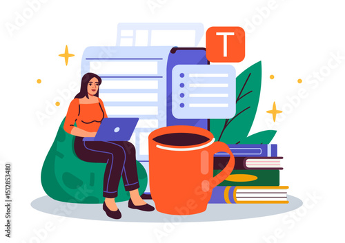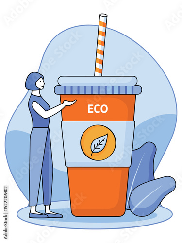 Eco friendly planet Earth, reusable eco bags, cup, wind turbines, flat vector illustration. Clean planet. Alternative green energy. Zero waste.