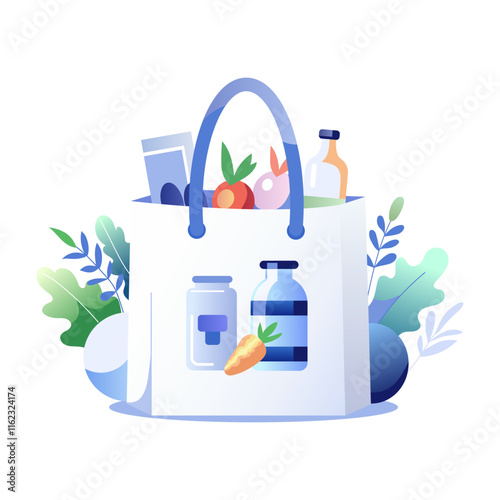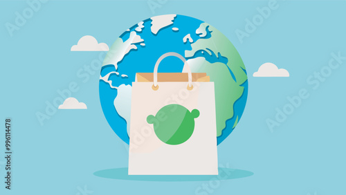 Eco friendly planet Earth, reusable eco bags, cup, wind turbines, flat vector illustration. Clean planet. Alternative green energy. Zero waste.