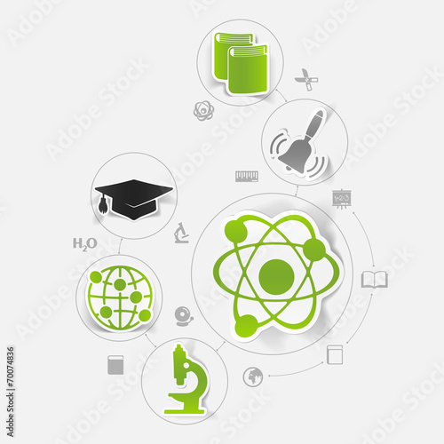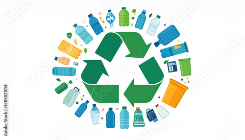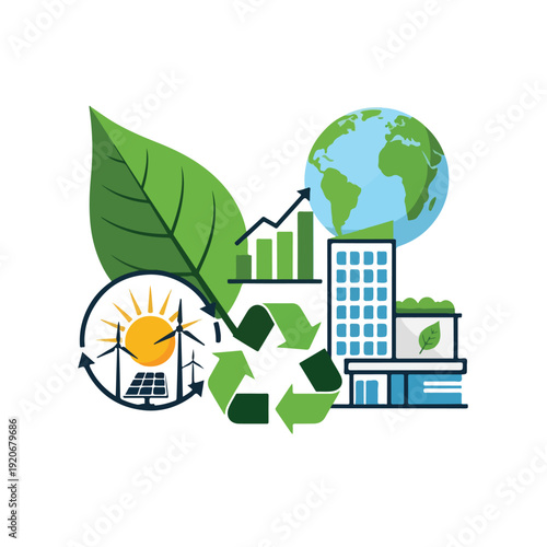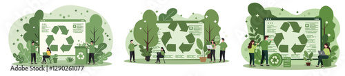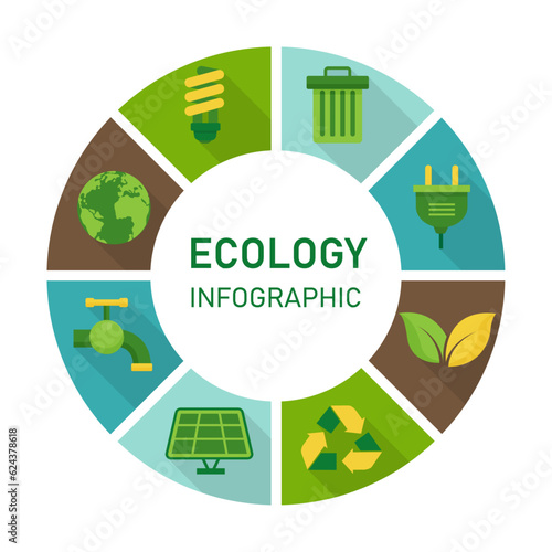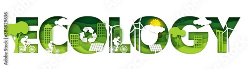Ecology word with paper cut family characters riding bicycles with backpacks, eco friendly city, solar panels, windmills. Vector illustration in paper art style. Ecology typography banner template.