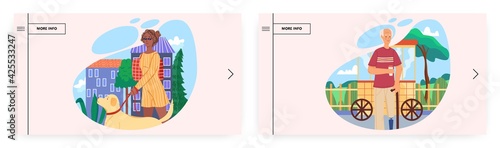 Education landing page design, website banner template set, flat vector illustration. Happy student moving to college campus and celebrating graduation wearing gown and hat. University education.