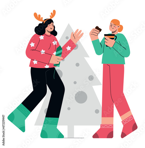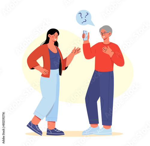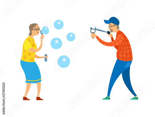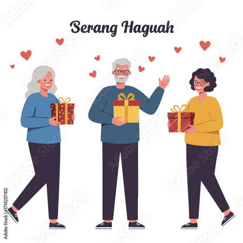 Elderly woman giving romantic gift box with balloons for senior man vector illustration. Happy loving senior couple celebrating birthday party or anniversary isolated on white background