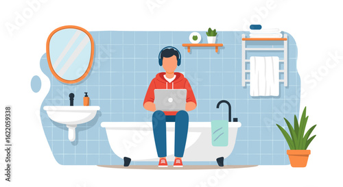 Elderly woman taking shower in bathroom home vector illustration. Everyday routine and hygiene concept