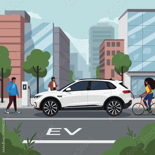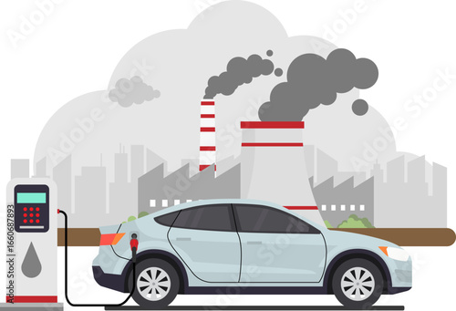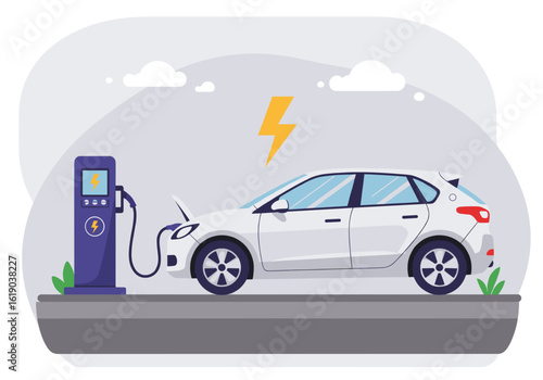 Electric vehicle charging station. Man recharging electric car with cable using energy from rechargeable battery, flat vector illustration. Eco-friendly car, ecology, environment protection.