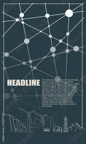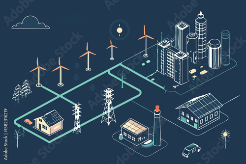 Electricity concept vector flat illustration. High voltage power lines, solar panel, light bulb, extension cord. Electric power production and consumption composition for web banner, website page etc