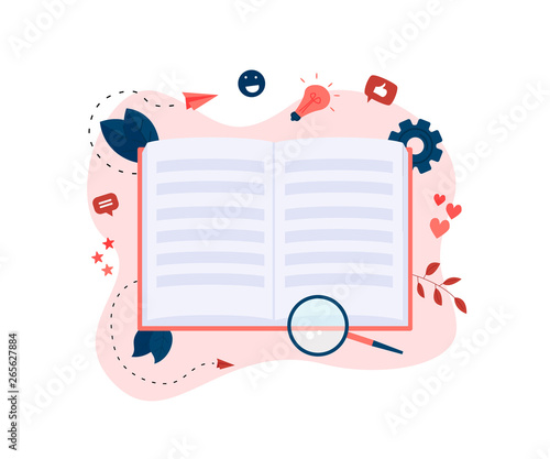 Vector illustration of big tablet with e-book reader and young people reading books using digital devices tablet, laptop personal computer. Electronic books concept for web banner, website page etc.