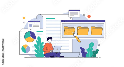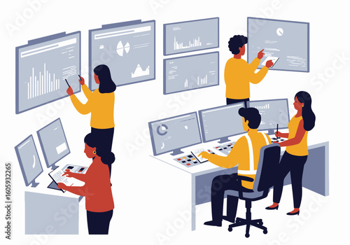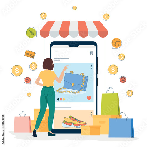 Electronics store, flat vector illustration. Home appliances, audio equipment, computers, smartphones on shelves, seller and buyer cartoon characters.
