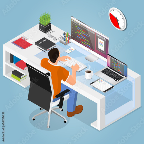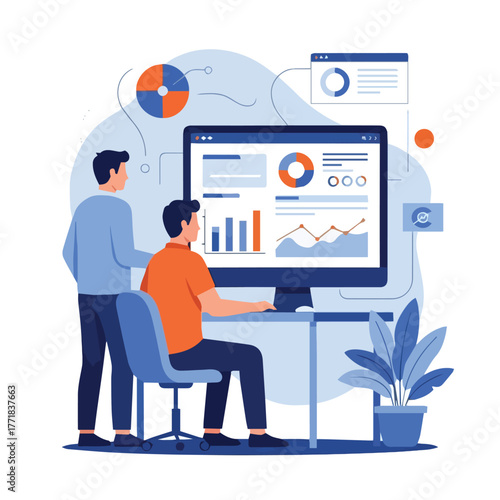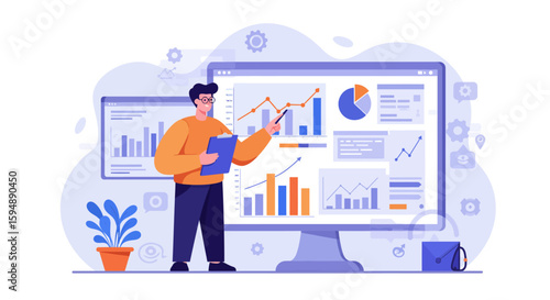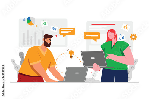 Electronics store, flat vector illustration. Home appliances, audio equipment, computers, smartphones on shelves, seller and buyer cartoon characters.