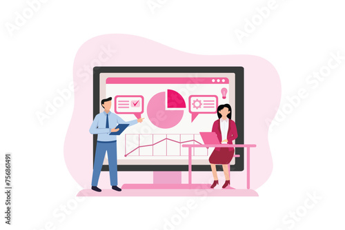 Email marketing tactics, vector illustration. Newsletter, drip marketing concept with characters analysing e-marketing stats for web banner, website page etc.