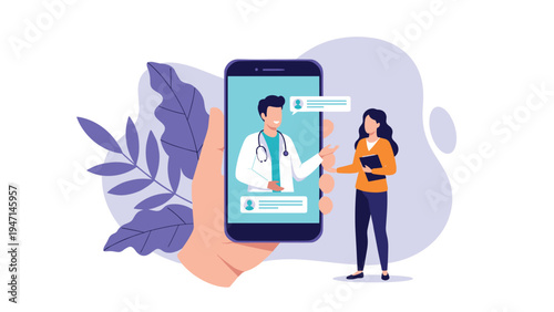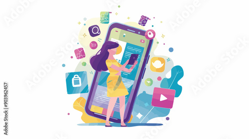 Mobile email marketing strategy, vector illustration. Huge smartphone and happy micro male and female characters flying on paper plane, holding round diagrams.