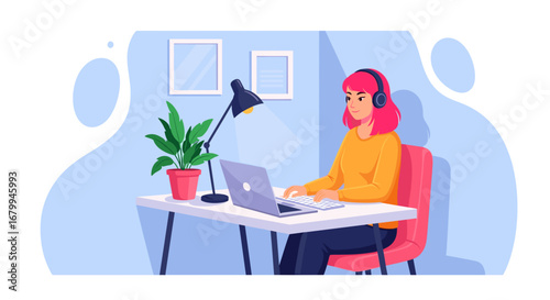 Vector illustration of woman holding broken pipe and calling to emergency service. Flat style design element, icon isolated on white background.