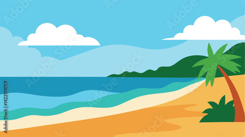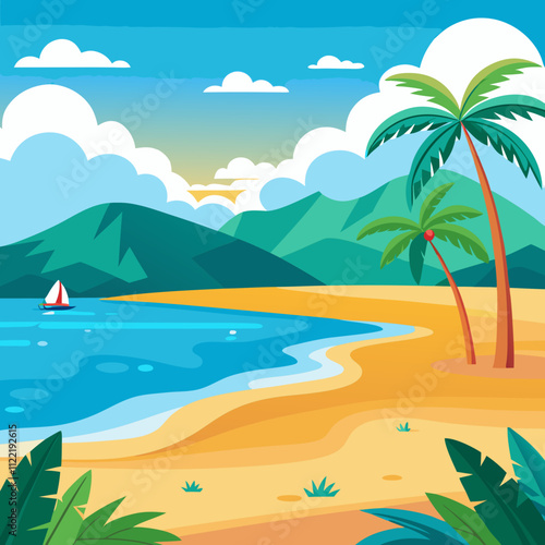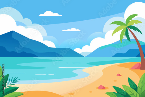 Empty tropical beach at resort vector illustration. Seaside of bay with warm water, sand, palm tree and mountain rock cliff at sunny day