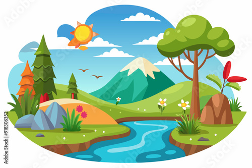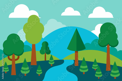 Enchanted waterfall flowing from mountain cliff over forest landscape papercut vector illustration. Fantasy stream, travel scenic and wild oasis panorama concept