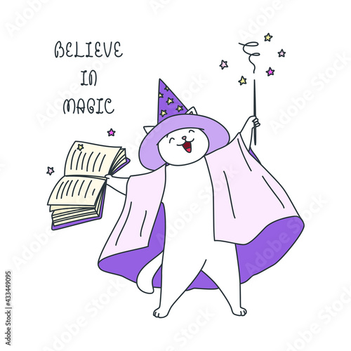 Enchantress vector. Cartoon character wearing pretty hat, costume illustration. Isolated female fantasy girl with magic wand. Magical fairytale sorcerer. Child in halloween dress on white background