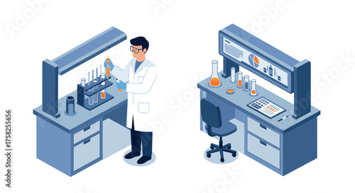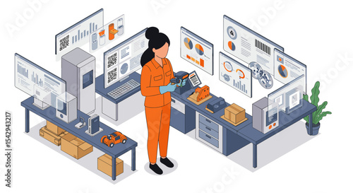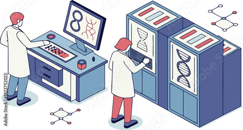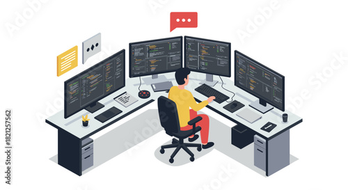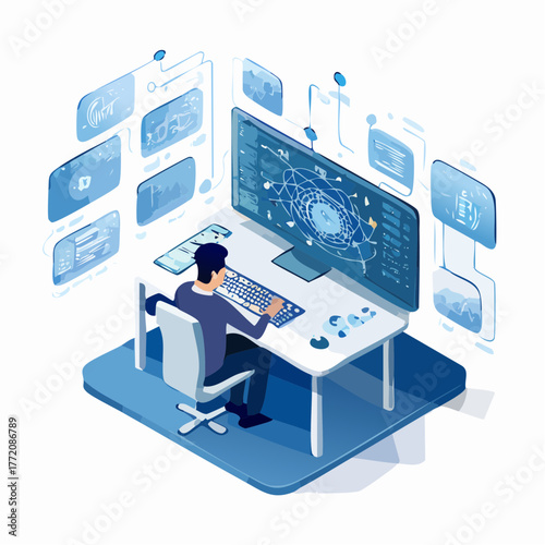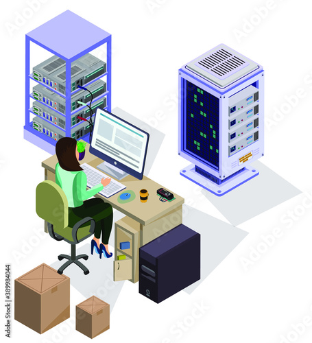 Engineer repairing and fixing server network in data center, flat vector isometric illustration. Server maintenance and repair services.