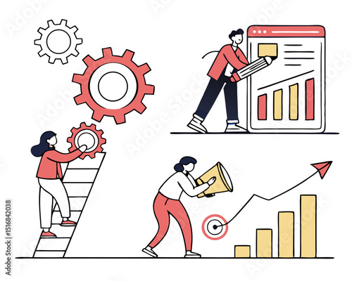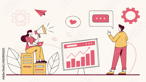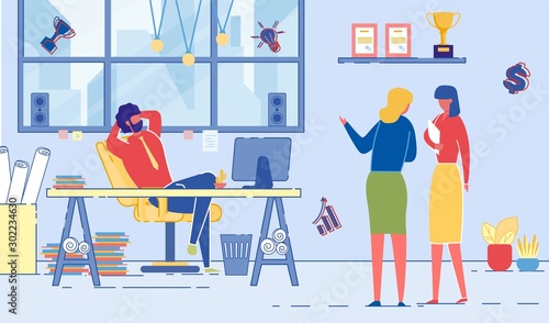 Engineers cartoon characters creating robot in tech robotics laboratory, flat vector illustration. Artificial intelligence technology, robot invention. Robotics science.