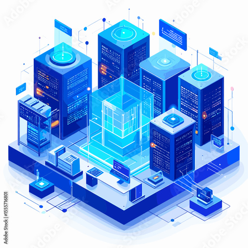 Engineers installing servers in data center, flat vector isometric illustration. Network server setup, installation and configuration hardware, software.