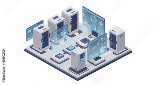 Engineers installing servers in data center, flat vector isometric illustration. Network server setup, installation and configuration hardware, software.