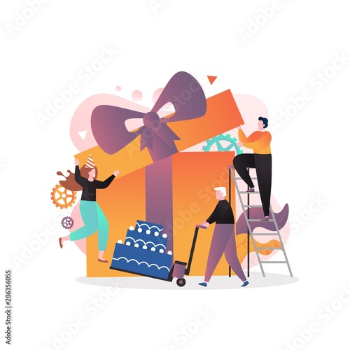 Vector illustration of tiny people watering and trimming plant growing in big pot, picking up garbage into trash bag. Environmental protection concept for web banner, website page etc.