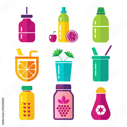 Equipment and accessories for sports nutrition, fitness supplements, protein cocktail and replenish body vitamin preparation vector illustration. Various bottle and shakers, guide steps of using for cooking