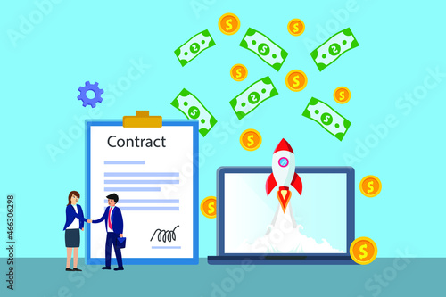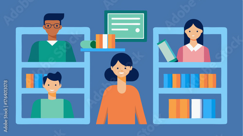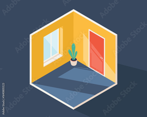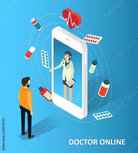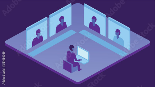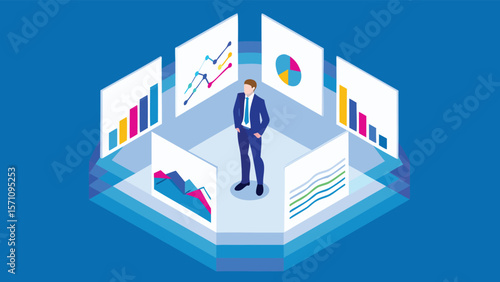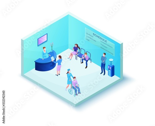 Exhibition booth concept vector flat 3d illustration. Isometric trade show stand mockups, young woman promoter and visitors.
