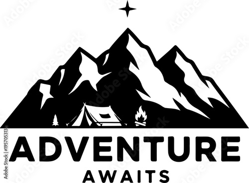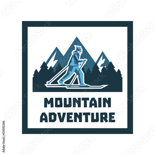 Extreme adventure and camping in mountain forest vintage label. Nature camp graphic sticker emblem isolated on white background. Travel expedition and mountaineering