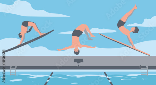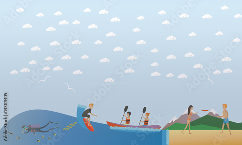 Vector illustration of surfer riding on ocean wave, diver underwater, people paddling, playing frisbee. Beach activity, extreme water sports, outdoor games concept design element in flat style.