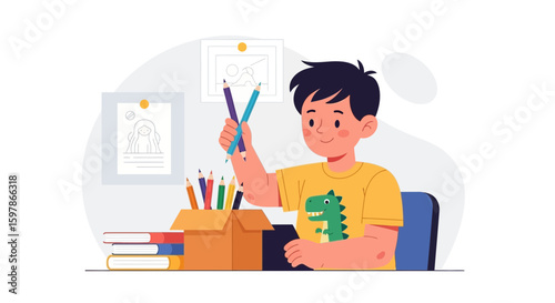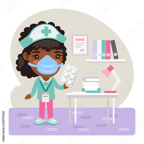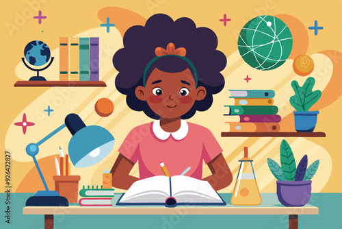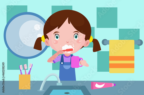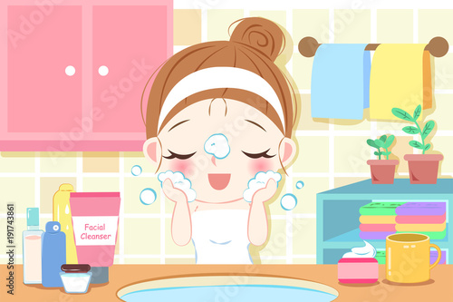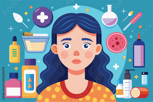 Face beauty and makeup vector poster banner template. Young woman sitting at table with cosmetic skin care products and huge mirror. Makeup classes, beauty parlor services, face care routine.