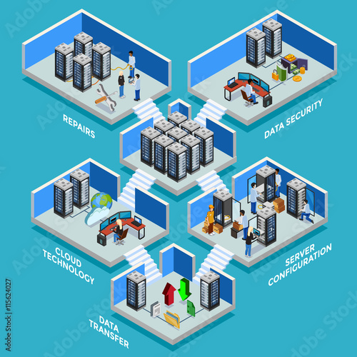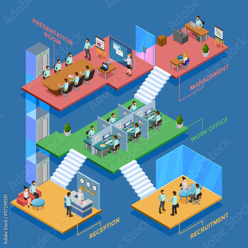 Factory automation vector flat isometric poster set. Electronics factory, Packaging manufactory, Car assembly, Medical factory concept design elements for web banners, print, infographics.