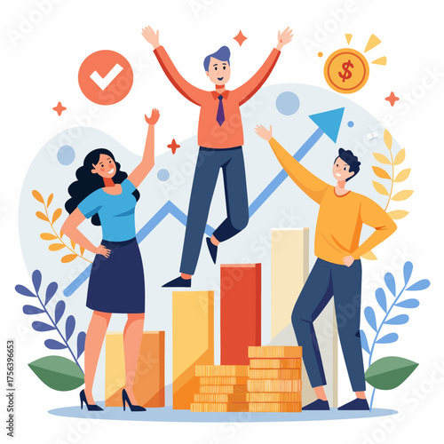 Falling down arrow chart, businessman bankrupt, shocked employees, flat vector illustration. Business failure, career collapse, financial problems, bankruptcy, economic crisis.
