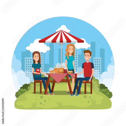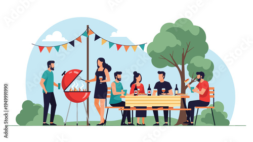 Family couple having backyard bbq. Woman playing with pet dog while sitting on chair and man cooking meat on barbeque grill. Vector flat style design illustration.