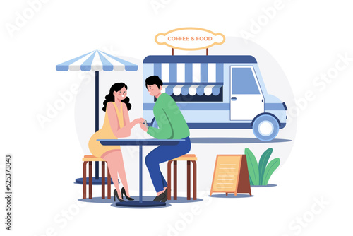 Family couple on picnic or bbq. Woman and man eating grilled sausages while sitting at picnic table. Vector flat style design illustration.
