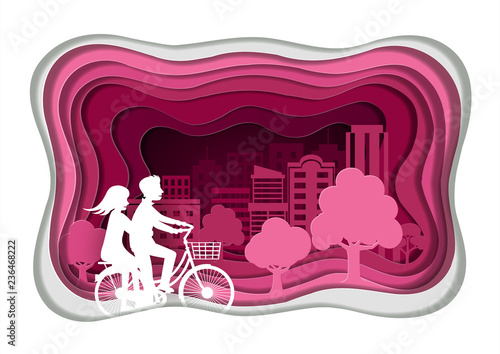 Family biking, vector layered paper cut style illustration. Happy family with backpacks riding bicycles, enjoying outdoor walking. Biking tourism, active weekend concept for poster, banner etc.