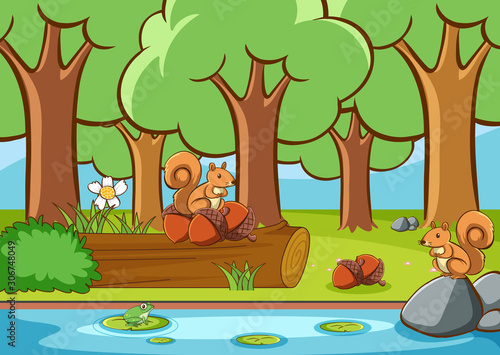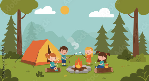 Family camp in forest vector illustration. Cartoon people rest in mountain during summer vacation trip. Outdoor picnic scene. Parent and child recreation at campfire. Hiking travel landscape