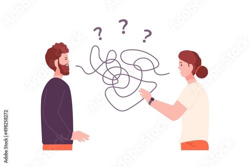 Family discussion vector flat style design illustration. Grandparents, parents and their kids daughter and son with speech bubbles. Problem solving, family dialog and relationships concept.