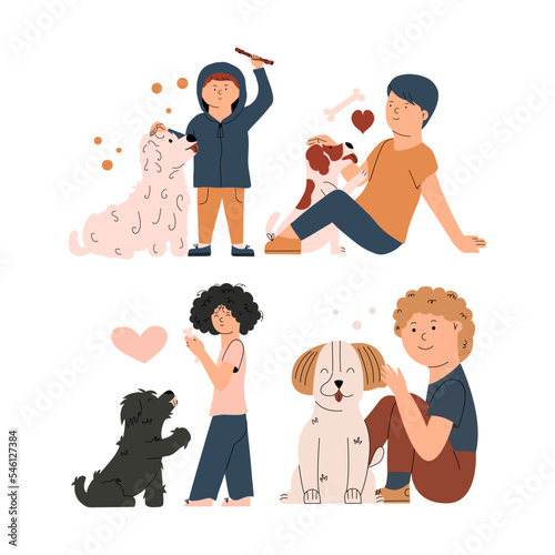 Family Easter celebration scene set, flat vector isolated illustration. Happy grandparents, parents and kids with bunny, decorated Easter eggs, cake, basket and pussy willow branches. Egg hunt game.