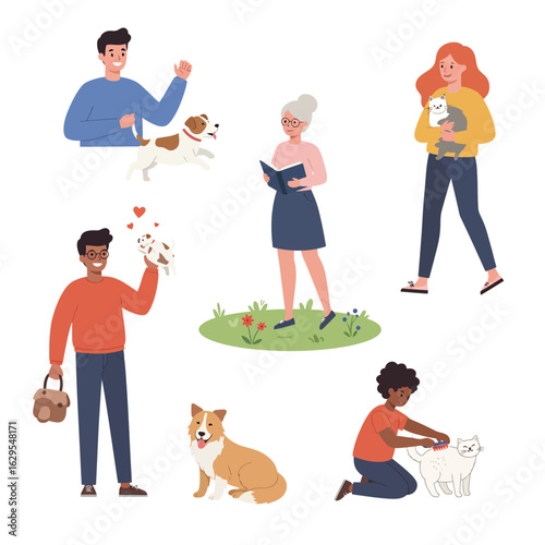 Family Easter celebration scene set, flat vector isolated illustration. Happy grandparents, parents and kids with bunny, decorated Easter eggs, cake, basket and pussy willow branches. Egg hunt game.