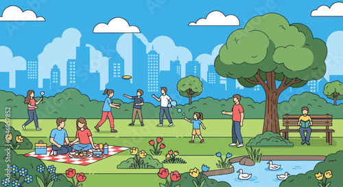 Vector illustration of fathers playing football with their kids. Family outdoor games concept flat style design elements.
